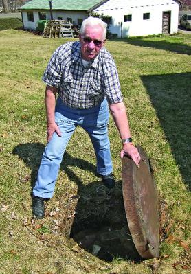 Wayne Bissell of Dover lifts the lid on a holding tank used by the Sugar Creek Salt Co. in the late 1800s at the site of the companyıs salt well off of Saltwell Rd. in Dover Township. Courtesy Dover-New Philadelphia Times-Reporter http://www.timesreporter.com