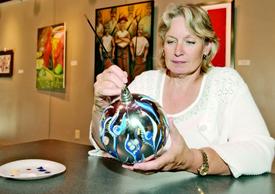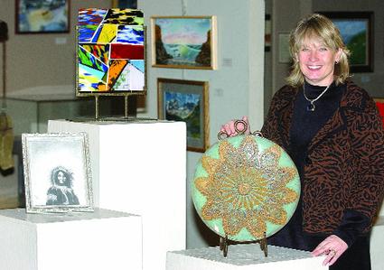 The Tuscarawas County Center for the Arts Director Jeannine Kennedy poses with some of the art from the Tuscarawas County Art Guild 40th Anniversary Show. Courtesy Dover-New Philadelphia Times-Reporter http://www.timesreporter.com