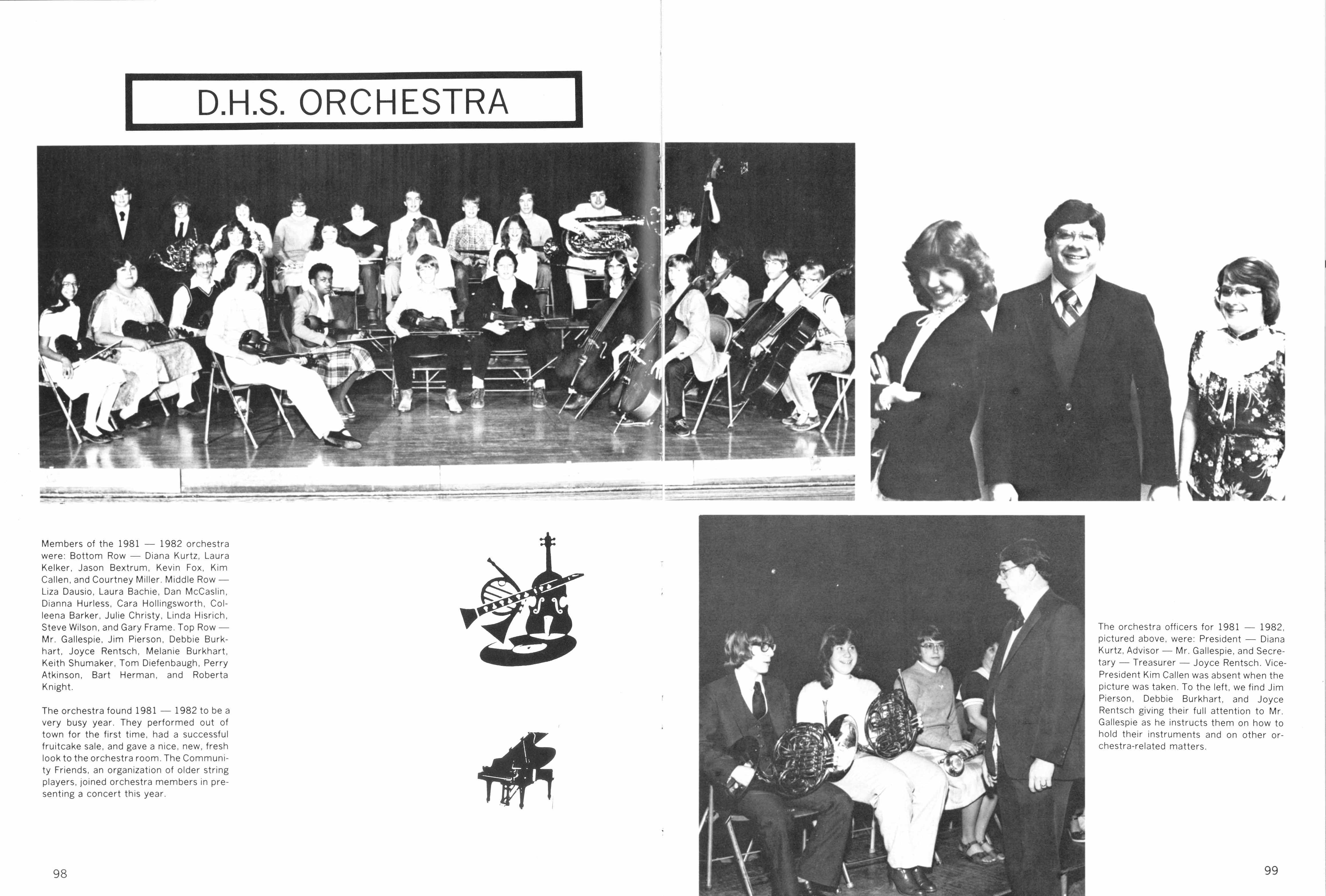 Orchestra Officers: President Diana Kurtz, Advisor Larry Gillaspie, Secretary-Treasurer Joyce Rentsch, Vice President Kim Callen (absent from photo)