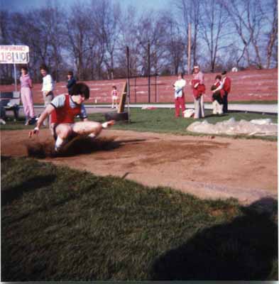 I put everything into the first jump, shown again in slow speed. The last two were shorter, and I did not qualify for the finals, finishing tied for 10th(?). On the first jump, I achieved such great vertical mid air height I partially panicked and dropped my legs prematurely, which shortened the jump distance. The better technique would have been to advance from the 1.5 hitch kick to the 2.5 hitch kick used by jumpers achieving greater lengths, but since I'd never jumped so far before I was done with the 1.5 rotation mid-flight and had nothing to do with my legs afterward since I was still in the air. According to the adjacent pylons, had I at least extended my legs normally and done a summer-sault, the distance would have been about 24', good enough to win 1st place by a foot on that jump alone, and enough to have broken the DHS record. C'est la vie.