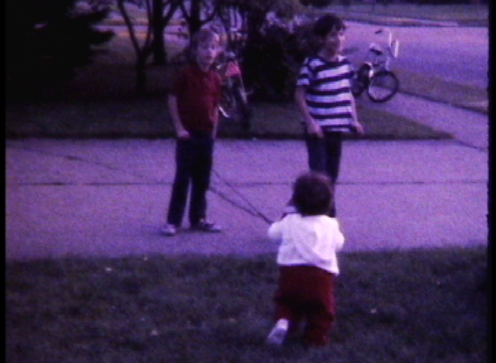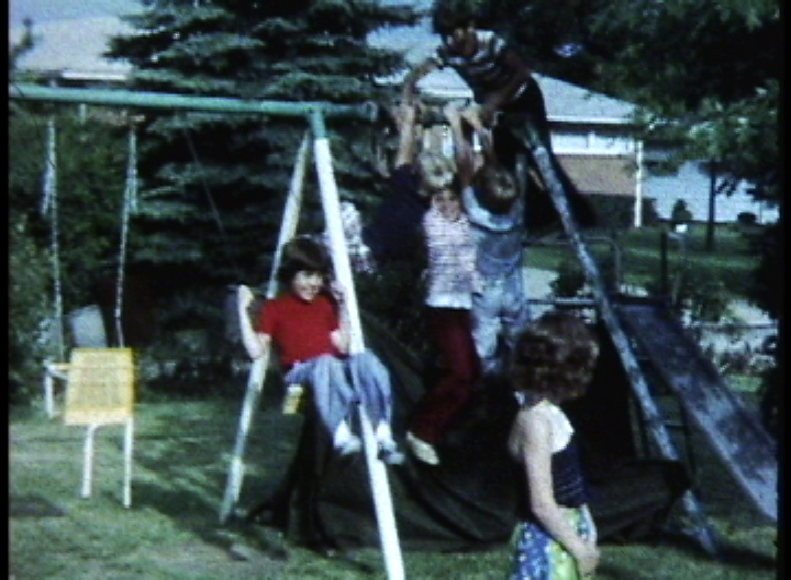 John Bienko, Daniel, Cheryl, Beth, Amy, & Lynn Van Epps playing with a sprinkler at the Van Epps' backyard c.1977-8. 46 sec, .mov 19.6MB.