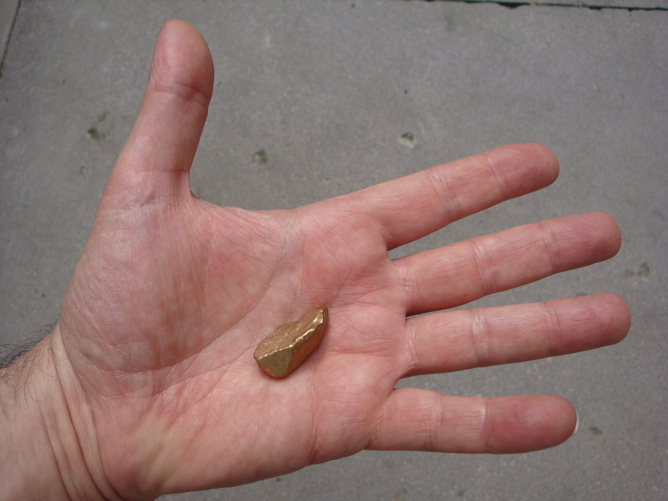 George Telle III (father of Doug) at the 2010 Dover Memorial Day Parade. Mr. Telle, a.k.a "Bald Eagle" of the Germanic Indian tribe, was handing out free gold to the crowd, and this nugget weighed in at .2 ounces. The price of a troy ounce of gold closed at $1234.40 on 6-15-2010, meaning it was worth $225.02. Thanks Chief, got anymore?