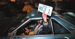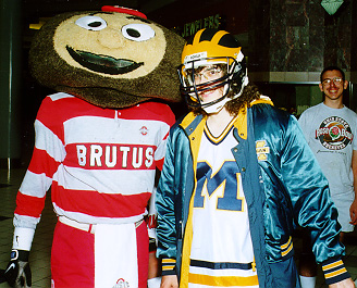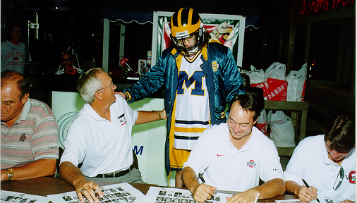 OSU Football Tourbus @ New Towne Mall (At left - a lost large hairless nut; At right - A.D. Andy Geiger, Head Coach John Cooper)